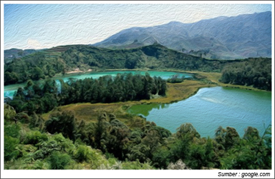 Di hari yang cerah, kita bisa melihat danau itu penuh warna yang indah dan mengagumkan. Warna itu berasal dari bayangan hutan, tanaman, bunga-bunga, dan langit di sekitar telaga. Namun orang mengatakan, warna-warna itu berasal dari kalung Putri yang tersebar di dasar telaga. |