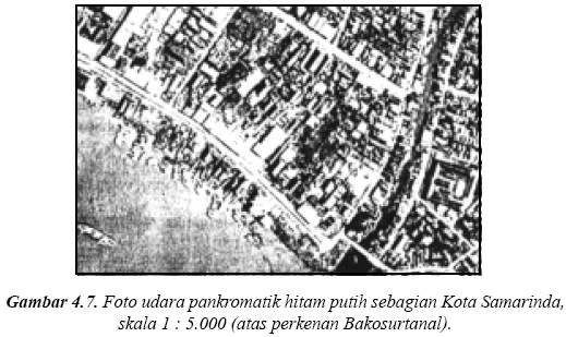 | Sungai memiliki tekstur permukaan air yang seragam dengan rona yang gelap jika airnya jernih, atau cerah jika keruh. Arah aliran sungai ditandai oleh bentuk sungai yang lebar pada bagian muara, pertemuan sungai memiliki sudut lancip sesuai dengan arah aliran, perpindahan meander ke arah samping dan ke arah bawah (muara), gosong sungai meruncing ke arah hulu dan melebar ke arah muara (lihat gambar 4.6 dan 4.7). | ||||