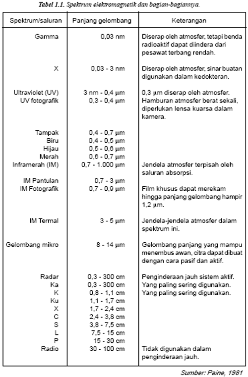 | Seperti telah disebutkan bahwa salah satu tenaga yang dimanfaatkan dalam penginderaan jauh antara lain berasal dari matahari dalam bentuk tenaga elektromagnetik (lihat tabel 1). Matahari merupakan sumber utama tenaga elektromagnetik ini. Di samping matahari sebagai sumber tenaga alamiah, ada juga sumber tenaga lain, yakni sumber tenaga buatan. | ||